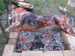 Se indeasa prin carnita berbecutului usturoi si slanina, se sareaza si se lasa animalul in bait cu piperul boabe, frunzele de dafin, ceapa ulei, ceva litri de vin rosu (de casa am avut noi), si apa sa-l acopere. Se lasa asa peste noapte. A doua zi se umple cu ceapa , usturoi si slanina , se coase si se pune pe protap. Sta acolo pret de o ora doua , timp in care se mai unge cu ulei si condimente. Noi am avut caramida refractara si s-a facut acolo un cuptoras in care am copt apoi si ceva cartofi!