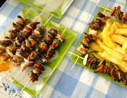 Pe farfurie se aşează salata şi peste ea se pun frigăruile.